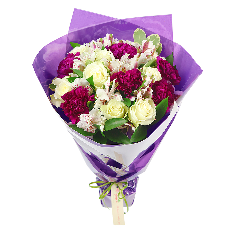 Experience the pure joy of vibrant blooms with our meticulously arranged summer bouquet. This luxurious arrangement combines the timeless appeal of white roses, the delicate charm of alstroemeria, and the deep, romantic hues of purple carnations. Enhanced by a lush cascade of greenery, every element is hand-selected to guarantee outstanding freshness and beauty.