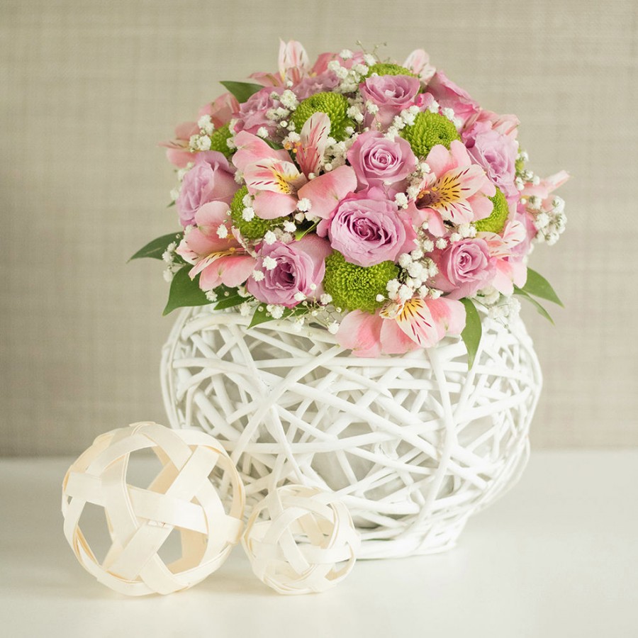 Bathed in gentle studio light reminiscent of a sunny Fulham afternoon, this handcrafted centerpiece captures both artistry and warmth as it rests atop a pristine white table. The arrangement is anchored by a striking white vase fashioned from slender, intertwined strips-its open lattice resembling modern basketry seen in Fulham's local boutiques. Its rounded form exudes stability and contemporary flair, serving as the perfect foundation for a lush gathering of pastel pink and lavender roses, their velvety texture suggesting moments of quiet luxury. Elegant pink alstroemeria-trumpet-shaped and lavishly streaked-add refinement, while bright lime green button chrysanthemums infuse youthful energy that recalls walks along Eel Brook Common in high spring. Sprigs of delicate white baby's breath float among the blooms, lending a weightless, softening finish, while gleaming green leaves give grounding depth. To the left, two decorative spheres, hand-woven with pale fibrous strands, subtly echo the vase's textural artistry, their positioning both balanced and playfully off-center like found objects from local craft markets between Chelsea and Hammersmith. The gently textured beige wall behind allows the arrangement's fresh palette and intricate workmanship to take centre stage. This piece embodies the heart of Fulham's sophistication-perfect as a wedding table feature, a statement for at-home entertaining, or a heartfelt gesture for marking special moments within the Fulham community.