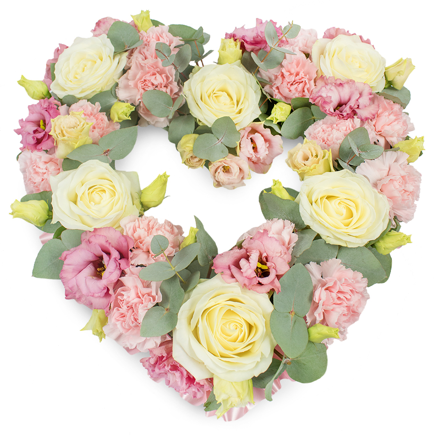 Express your heartfelt sentiments with our Graceful Heart Tribute Arrangement. This exquisite bouquet showcases a beautiful blend of white roses, pink carnations, pink lisianthus, and eucalyptus leaves, meticulously arranged to create a unique and stunning display.